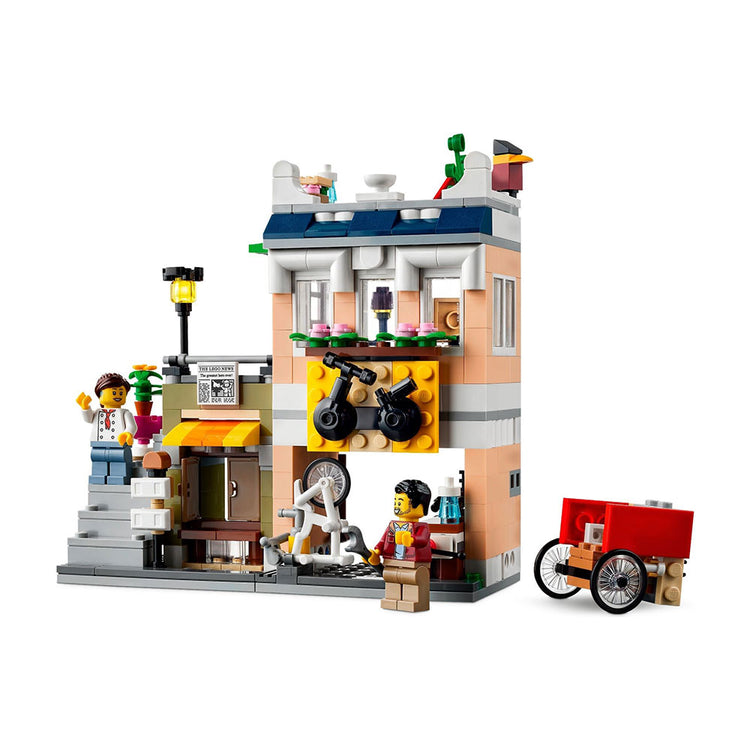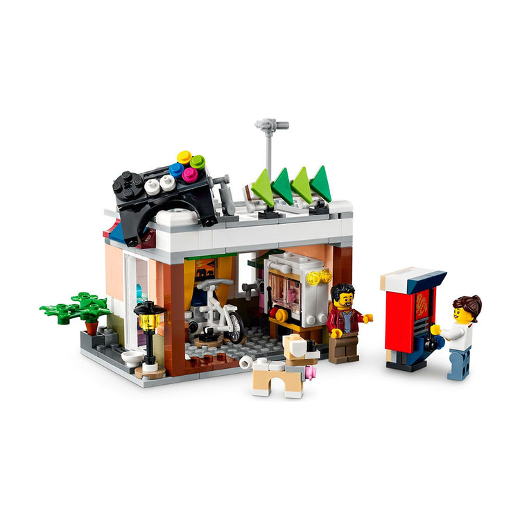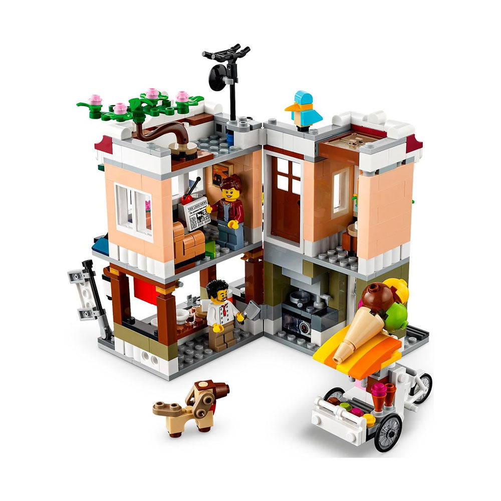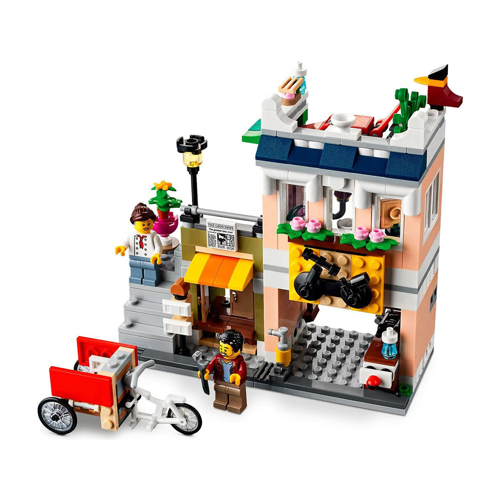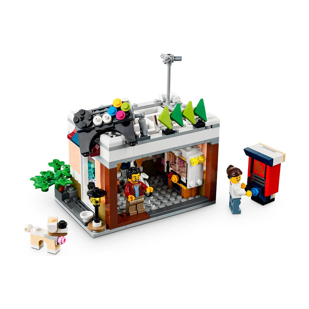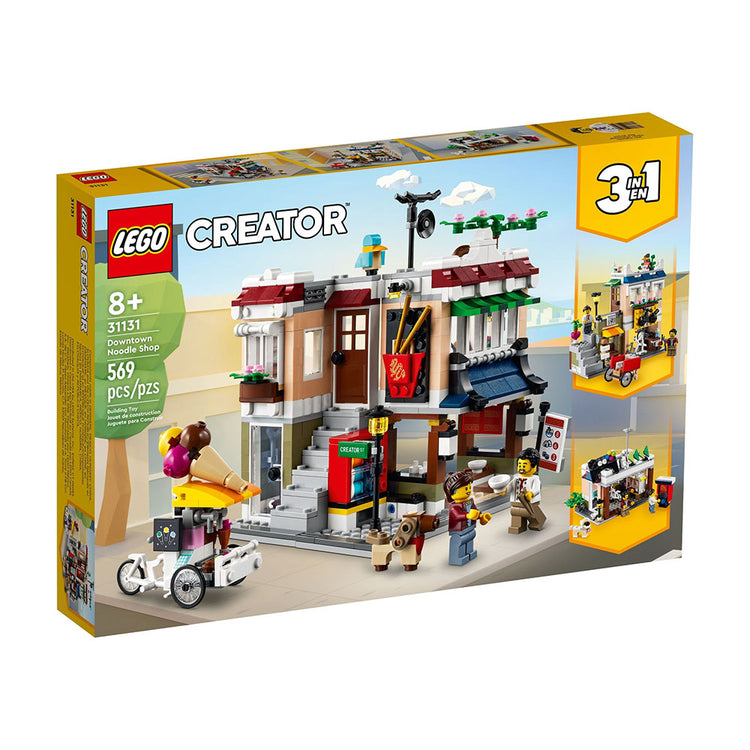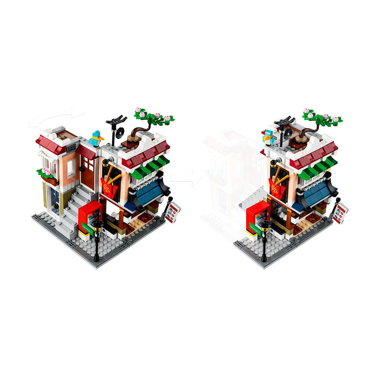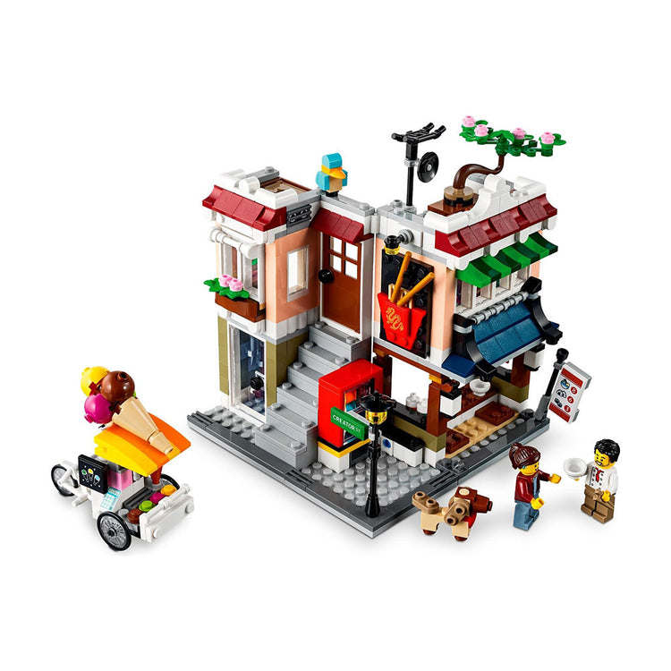 LEGO Creator 3in1 Downtown Noodle Shop. This 2-story townhouse with a Noodle Shop at street level and a supercool apartment and roof terrace above it. The house includes 2 minifigures and also folds open at the back to give even more play options. That is just 1 of the 3 options this build offers, build them all and let us know which one was your favourite.