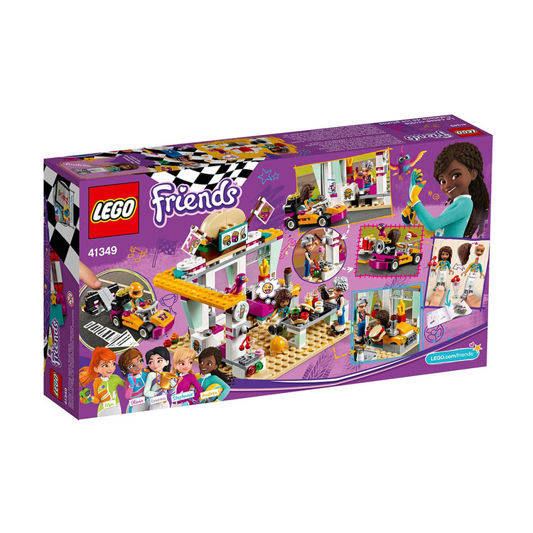 This Drifting Diner set has a burger grill, takeout window with cash register, stylized car-shaped table with bench, and an amazing giant burger icon on the roof. Outside there’s a screen for drive-in movies with handy side tables. You'll also find Andrea's go-kart and a go-kart launcher in this retro LEGO Friends set. Includes 2 mini-doll figures and a bird figure.
